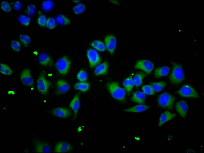 Immunofluorescence staining of Hela cells with CSB-PA811616LA01HU at 1:133, counter-stained with DAPI. The cells were fixed in 4% formaldehyde, permeabilized using 0.2% Triton X-100 and blocked in 10% normal Goat Serum. The cells were then incubated with the antibody overnight at 4°C. The secondary antibody was Alexa Fluor 488-congugated AffiniPure Goat Anti-Rabbit IgG(H+L).