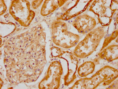 IHC image of CSB-PA020888HA01HU diluted at 1:1200 and staining in paraffin-embedded human kidney tissue performed on a Leica BondTM system. After dewaxing and hydration, antigen retrieval was mediated by high pressure in a citrate buffer (pH 6.0). Section was blocked with 10% normal goat serum 30min at RT. Then primary antibody (1% BSA) was incubated at 4°C overnight. The primary is detected by a biotinylated secondary antibody and visualized using an HRP conjugated SP system.