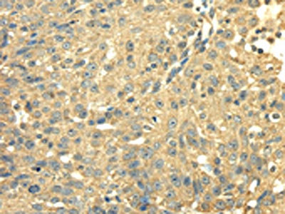 The image on the left is immunohistochemistry of paraffin-embedded Human thyroid cancer tissue using CSB-PA177790(SDHA Antibody) at dilution 1/40, on the right is treated with fusion protein. (Original magnification: ×200)