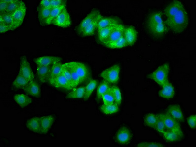 Immunofluorescence staining of HepG2 cells with CSB-PA866208LA01HU at 1:33, counter-stained with DAPI. The cells were fixed in 4% formaldehyde, permeabilized using 0.2% Triton X-100 and blocked in 10% normal Goat Serum. The cells were then incubated with the antibody overnight at 4°C. The secondary antibody was Alexa Fluor 488-congugated AffiniPure Goat Anti-Rabbit IgG(H+L).