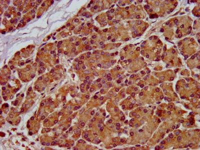 IHC image of CSB-PA866208LA01HU diluted at 1:100 and staining in paraffin-embedded human pancreatic tissue performed on a Leica BondTM system. After dewaxing and hydration, antigen retrieval was mediated by high pressure in a citrate buffer (pH 6.0). Section was blocked with 10% normal goat serum 30min at RT. Then primary antibody (1% BSA) was incubated at 4°C overnight. The primary is detected by a biotinylated secondary antibody and visualized using an HRP conjugated SP system.