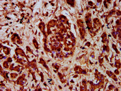 IHC image of CSB-PA622647LA01HU diluted at 1:400 and staining in paraffin-embedded human pancreatic cancer performed on a Leica BondTM system. After dewaxing and hydration, antigen retrieval was mediated by high pressure in a citrate buffer (pH 6.0). Section was blocked with 10% normal goat serum 30min at RT. Then primary antibody (1% BSA) was incubated at 4°C overnight. The primary is detected by a biotinylated secondary antibody and visualized using an HRP conjugated SP system.
