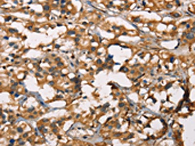 The image on the left is immunohistochemistry of paraffin-embedded Human thyroid cancer tissue using CSB-PA028431(SENP1 Antibody) at dilution 1/40, on the right is treated with synthetic peptide. (Original magnification: ×200)