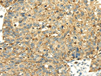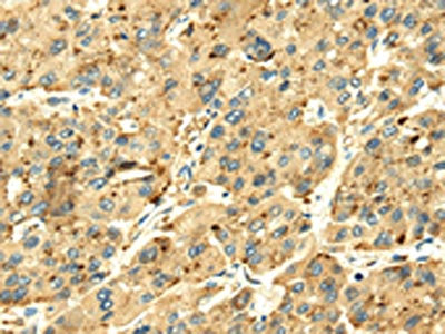 The image on the left is immunohistochemistry of paraffin-embedded Human liver cancer tissue using CSB-PA727078(SENP2 Antibody) at dilution 1/20, on the right is treated with fusion protein. (Original magnification: ×200)