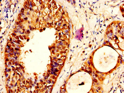 IHC image of CSB-PA11275A0Rb diluted at 1:500 and staining in paraffin-embedded human cervical cancer performed on a Leica BondTM system. After dewaxing and hydration, antigen retrieval was mediated by high pressure in a citrate buffer (pH 6.0). Section was blocked with 10% normal goat serum 30min at RT. Then primary antibody (1% BSA) was incubated at 4°C overnight. The primary is detected by a biotinylated secondary antibody and visualized using an HRP conjugated SP system.