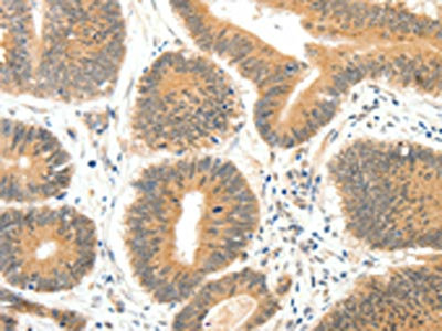 The image on the left is immunohistochemistry of paraffin-embedded Human colon cancer tissue using CSB-PA122189(SERPINE1 Antibody) at dilution 1/20, on the right is treated with fusion protein. (Original magnification: ×200)