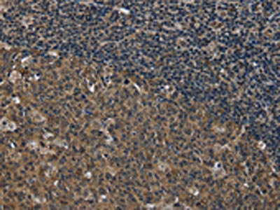 The image on the left is immunohistochemistry of paraffin-embedded Human tonsil tissue using CSB-PA995563(SETD7 Antibody) at dilution 1/20, on the right is treated with fusion protein. (Original magnification: ×200)