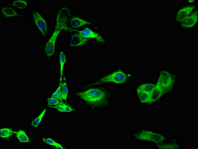 Immunofluorescent analysis of Hela cells using CSB-PA021189LA01HU at dilution of 1:100 and Alexa Fluor 488-congugated AffiniPure Goat Anti-Rabbit IgG(H+L)