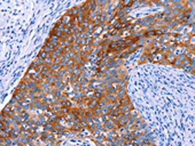 The image on the left is immunohistochemistry of paraffin-embedded Human cervical cancer tissue using CSB-PA193703(SGK2 Antibody) at dilution 1/20, on the right is treated with synthetic peptide. (Original magnification: ×200)