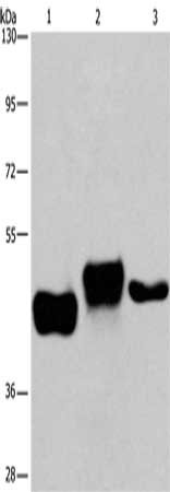 Gel: 6%SDS-PAGE, Lysate: 40 μg, Lane 1-3: Human placenta tissue, Human fetal liver tissue, HepG2 cells, Primary antibody: CSB-PA193703(SGK2 Antibody) at dilution 1/100, Secondary antibody: Goat anti rabbit IgG at 1/8000 dilution, Exposure time: 8 minutes