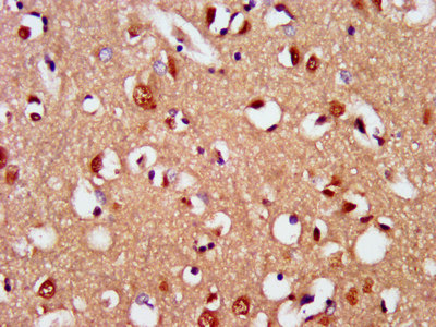 IHC image of CSB-PA621763LA01HU diluted at 1:400 and staining in paraffin-embedded human brain tissue performed on a Leica BondTM system. After dewaxing and hydration, antigen retrieval was mediated by high pressure in a citrate buffer (pH 6.0). Section was blocked with 10% normal goat serum 30min at RT. Then primary antibody (1% BSA) was incubated at 4°C overnight. The primary is detected by a biotinylated secondary antibody and visualized using an HRP conjugated SP system.