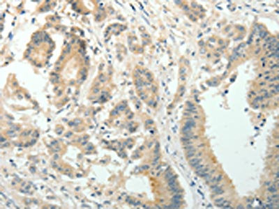 The image on the left is immunohistochemistry of paraffin-embedded Human colon cancer tissue using CSB-PA937428(SIRT3 Antibody) at dilution 1/30, on the right is treated with fusion protein. (Original magnification: ×200)