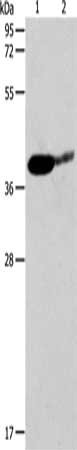 Gel: 12%SDS-PAGE, Lysate: 40 μg, Lane 1-2: Mouse brain tissue, human liver cancer tissue, Primary antibody: CSB-PA937428(SIRT3 Antibody) at dilution 1/500, Secondary antibody: Goat anti rabbit IgG at 1/8000 dilution, Exposure time: 90 seconds