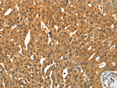 The image on the left is immunohistochemistry of paraffin-embedded Human ovarian cancer tissue using CSB-PA143745(SIRT4 Antibody) at dilution 1/25, on the right is treated with fusion protein. (Original magnification: ×200)