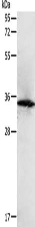 Gel: 12%SDS-PAGE, Lysate: 40 μg, Lane: MCF7 cells, Primary antibody: CSB-PA143745(SIRT4 Antibody) at dilution 1/400, Secondary antibody: Goat anti rabbit IgG at 1/8000 dilution, Exposure time: 1 minute
