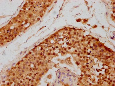 IHC image of CSB-PA021347LA01HU diluted at 1:700 and staining in paraffin-embedded human testis tissue performed on a Leica BondTM system. After dewaxing and hydration, antigen retrieval was mediated by high pressure in a citrate buffer (pH 6.0). Section was blocked with 10% normal goat serum 30min at RT. Then primary antibody (1% BSA) was incubated at 4°C overnight. The primary is detected by a biotinylated secondary antibody and visualized using an HRP conjugated SP system.