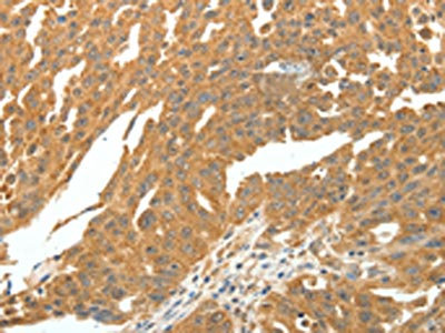 The image on the left is immunohistochemistry of paraffin-embedded Human ovarian cancer tissue using CSB-PA371951(SKP1 Antibody) at dilution 1/30, on the right is treated with fusion protein. (Original magnification: ×200)