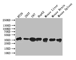 Positive WB detected in: HT29 whole cell lysate, 293T whole cell lysate, U87 whole cell lysate, HepG2 whole cell lysate, Mouse Liver tissue lysate, Mouse Brain tissue lysate, Mouse Spleen tissue lysate