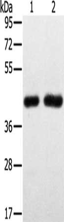 Gel: 8%SDS-PAGE, Lysate: 40 μg, Lane 1-2: Hepg2 cells, PC3 cells, Primary antibody: CSB-PA278926(SLC16A3 Antibody) at dilution 1/200, Secondary antibody: Goat anti rabbit IgG at 1/8000 dilution, Exposure time: 4 minutes