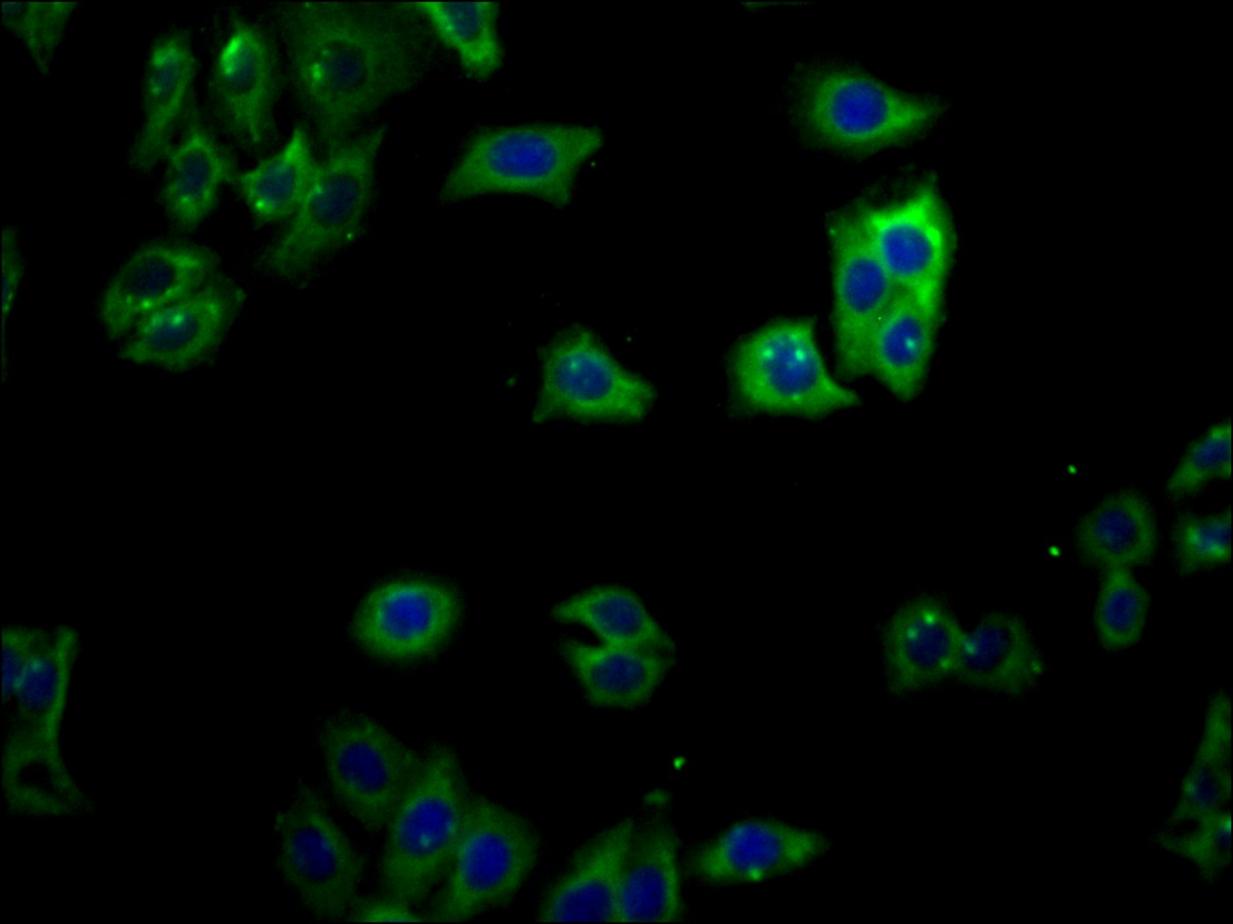 Immunofluorescence staining of HepG2 cell with CSB-PA021410LA01HU at 1:300, counter-stained with DAPI. The cells were fixed in 4% formaldehyde and blocked in 10% normal Goat Serum. The cells were then incubated with the antibody overnight at 4C. The secondary antibody was Alexa Fluor 488-congugated AffiniPure Goat Anti-Rabbit IgG(H+L).