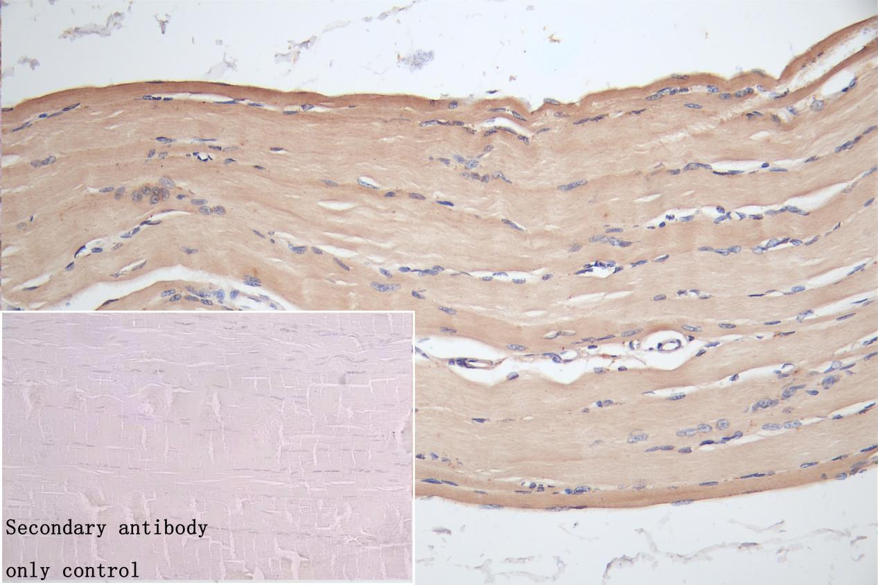 IHC image of CSB-PA021410LA01HU diluted at 1:300 and staining in paraffin-embedded human skeletal muscle tissue performed on a Leica BondTM system. After dewaxing and hydration, antigen retrieval was mediated by high pressure in a citrate buffer (pH 6.0). Section was blocked with 10% normal goat serum 30min at RT. Then primary antibody (1% BSA) was incubated at 4°C overnight. The primary is detected by a Goat anti-rabbit polymer IgG labeled by HRP and visualized using 0.05% DAB. Secondary antibody only control: uses 1% BSA instead of primary antibody