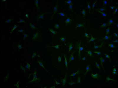 Immunofluorescence staining of U251 cells with CSB-PA021434LA11HU at 1:100, counter-stained with DAPI. The cells were fixed in 4% formaldehyde and blocked in 10% normal Goat Serum. The cells were then incubated with the antibody overnight at 4°C. The secondary antibody was Alexa Fluor 488-congugated AffiniPure Goat Anti-Rabbit IgG(H+L).