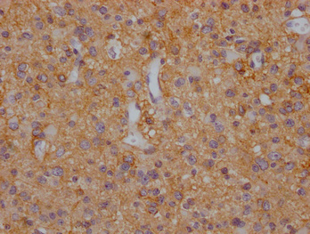 IHC image of CSB-PA021434LA11HU diluted at 1:200 and staining in paraffin-embedded human glioma cancer performed on a Leica BondTM system. After dewaxing and hydration, antigen retrieval was mediated by high pressure in a citrate buffer (pH 6.0). Section was blocked with 10% normal goat serum 30min at RT. Then primary antibody (1% BSA) was incubated at 4°C overnight. The primary is detected by a Goat anti-rabbit polymer IgG labeled by HRP and visualized using 0.05% DAB.