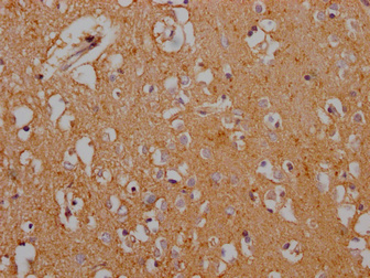 IHC image of CSB-PA021434LA11HU diluted at 1:200 and staining in paraffin-embedded human brain tissue performed on a Leica BondTM system. After dewaxing and hydration, antigen retrieval was mediated by high pressure in a citrate buffer (pH 6.0). Section was blocked with 10% normal goat serum 30min at RT. Then primary antibody (1% BSA) was incubated at 4°C overnight. The primary is detected by a Goat anti-rabbit polymer IgG labeled by HRP and visualized using 0.05% DAB.