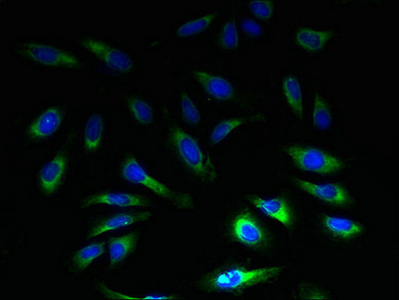 Immunofluorescent analysis of Hela cells using CSB-PA021437LA01HU at dilution of 1:100 and Alexa Fluor 488-congugated AffiniPure Goat Anti-Rabbit IgG(H+L)