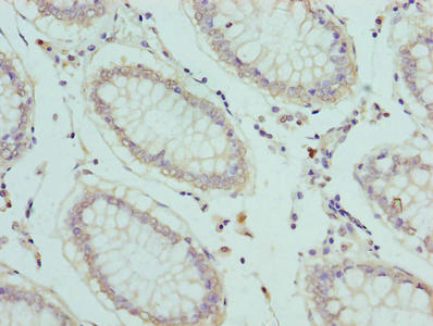 Immunohistochemistry of paraffin-embedded human colon cancer using CSB-PA021437LA01HU at dilution of 1:100
