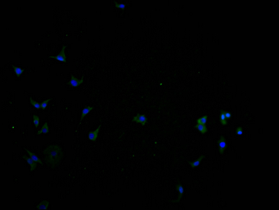 Immunofluorescence staining of SH-SY5Y cells with CSB-PA723708LA01HU at 1:100, counter-stained with DAPI. The cells were fixed in 4% formaldehyde and blocked in 10% normal Goat Serum. The cells were then incubated with the antibody overnight at 4°C. The secondary antibody was Alexa Fluor 488-congugated AffiniPure Goat Anti-Rabbit IgG(H+L).