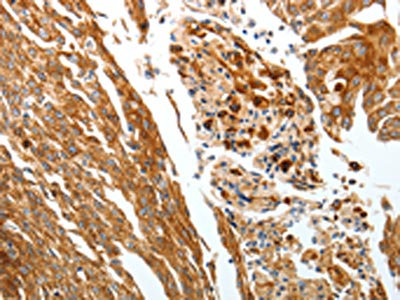 The image on the left is immunohistochemistry of paraffin-embedded Human cervical cancer tissue using CSB-PA193383(SLC22A3 Antibody) at dilution 1/25, on the right is treated with synthetic peptide. (Original magnification: ×200)