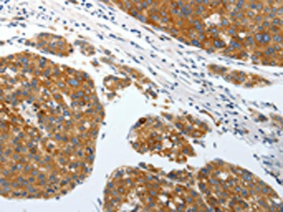 The image on the left is immunohistochemistry of paraffin-embedded Human liver cancer tissue using CSB-PA193383(SLC22A3 Antibody) at dilution 1/25, on the right is treated with synthetic peptide. (Original magnification: ×200)