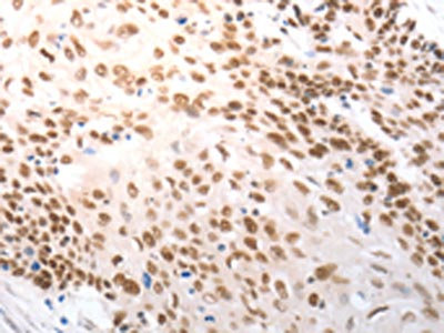 The image on the left is immunohistochemistry of paraffin-embedded Human cervical cancer tissue using CSB-PA240950(SLC22A8 Antibody) at dilution 1/25, on the right is treated with synthetic peptide. (Original magnification: ×200)