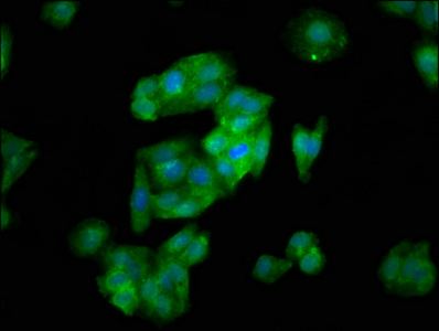 Immunofluorescence staining of HepG2 cells with CSB-PA861164LA01HU at 1:133, counter-stained with DAPI. The cells were fixed in 4% formaldehyde, permeabilized using 0.2% Triton X-100 and blocked in 10% normal Goat Serum. The cells were then incubated with the antibody overnight at 4°C. The secondary antibody was Alexa Fluor 488-congugated AffiniPure Goat Anti-Rabbit IgG(H+L).