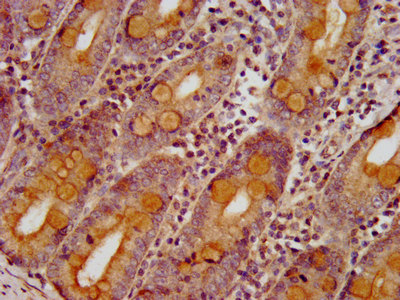 IHC image of CSB-PA861164LA01HU diluted at 1:400 and staining in paraffin-embedded human small intestine tissue performed on a Leica BondTM system. After dewaxing and hydration, antigen retrieval was mediated by high pressure in a citrate buffer (pH 6.0). Section was blocked with 10% normal goat serum 30min at RT. Then primary antibody (1% BSA) was incubated at 4°C overnight. The primary is detected by a biotinylated secondary antibody and visualized using an HRP conjugated SP system.