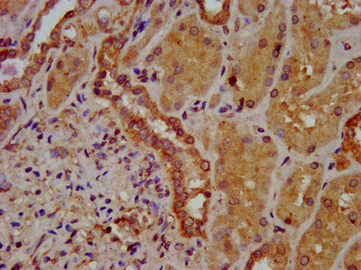 IHC image of CSB-PA861164LA01HU diluted at 1:400 and staining in paraffin-embedded human kidney tissue performed on a Leica BondTM system. After dewaxing and hydration, antigen retrieval was mediated by high pressure in a citrate buffer (pH 6.0). Section was blocked with 10% normal goat serum 30min at RT. Then primary antibody (1% BSA) was incubated at 4°C overnight. The primary is detected by a biotinylated secondary antibody and visualized using an HRP conjugated SP system.