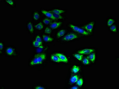 Immunofluorescent analysis of HepG2 cells using CSB-PA853496LA01HU at dilution of 1:100 and Alexa Fluor 488-congugated AffiniPure Goat Anti-Rabbit IgG(H+L)
