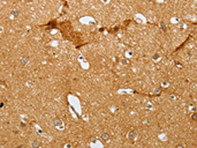 The image on the left is immunohistochemistry of paraffin-embedded Human brain tissue using CSB-PA596199(SLC2A5 Antibody) at dilution 1/12, on the right is treated with synthetic peptide. (Original magnification: ×200)