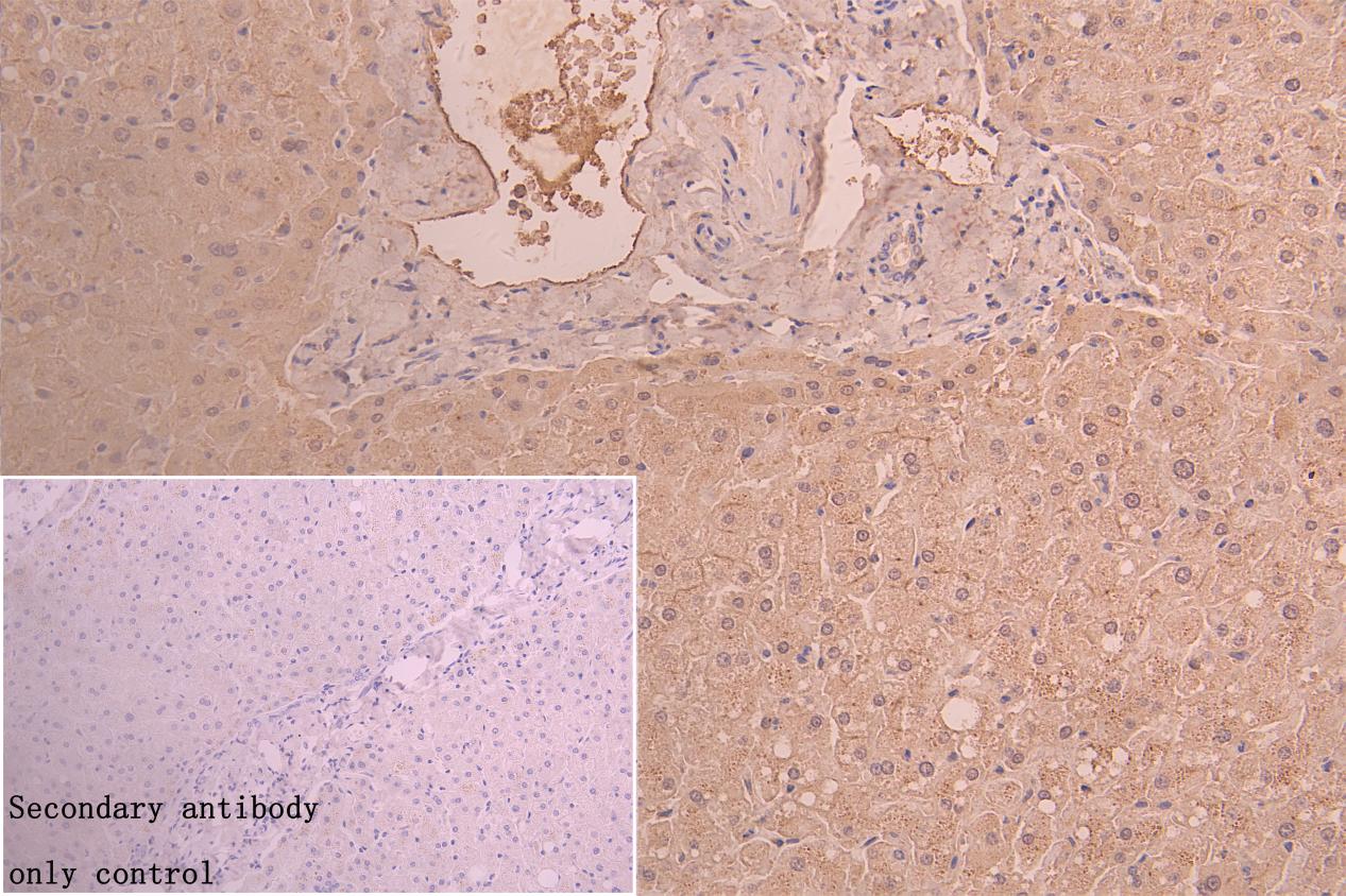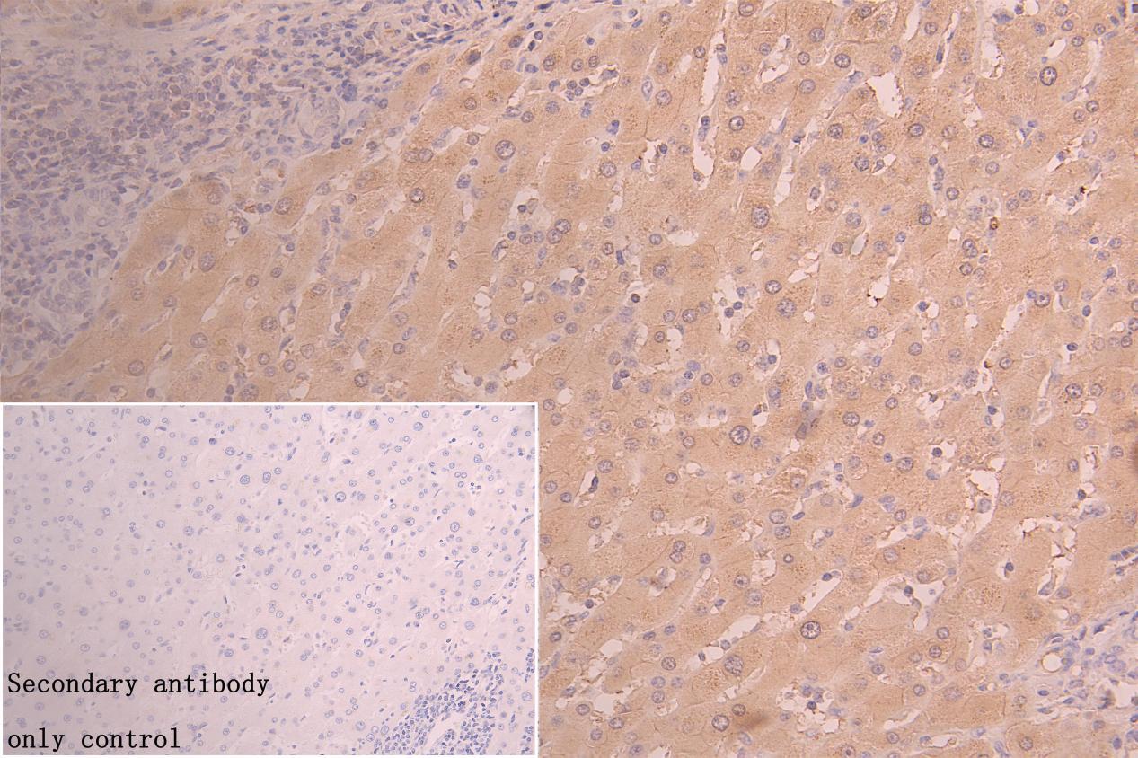 IHC image of CSB-PA747695LA01HU diluted at 1:50 and staining in paraffin-embedded human liver tissue performed on a Leica BondTM system. After dewaxing and hydration, antigen retrieval was mediated by high pressure in a citrate buffer (pH 6.0). Section was blocked with 10% normal goat serum 30min at RT. Then primary antibody (1% BSA) was incubated at 4°C overnight. The primary is detected by a Goat anti-rabbit polymer IgG labeled by HRP and visualized using 0.05% DAB. Secondary antibody only control: uses 1% BSA instead of primary antibody