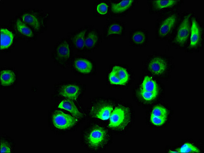 Immunofluorescent analysis of MCF-7 cells using CSB-PA674326LA01HU at dilution of 1:100 and Alexa Fluor 488-congugated AffiniPure Goat Anti-Rabbit IgG(H+L)
