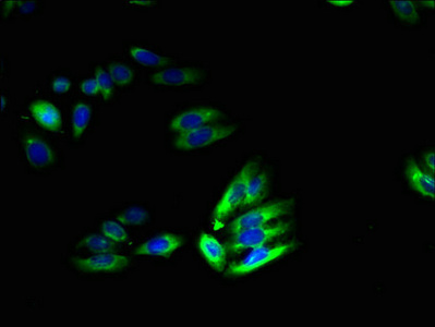 Immunofluorescent analysis of HepG2 cells using CSB-PA871607LA01HU at dilution of 1:100 and Alexa Fluor 488-congugated AffiniPure Goat Anti-Rabbit IgG(H+L)
