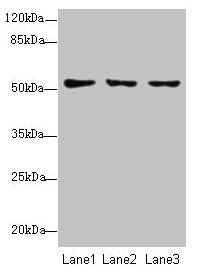 Predicted band size: 52 kDa