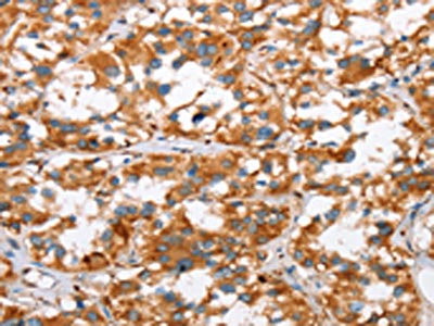 The image on the left is immunohistochemistry of paraffin-embedded Human gastric cancer tissue using CSB-PA546462(SLC4A1 Antibody) at dilution 1/30, on the right is treated with synthetic peptide. (Original magnification: ×200)