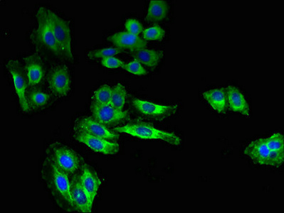Immunofluorescent analysis of HepG2 cells using CSB-PA875657LA01HU at dilution of 1:100 and Alexa Fluor 488-congugated AffiniPure Goat Anti-Rabbit IgG(H+L)