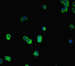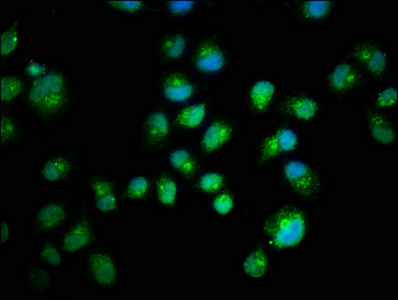 Immunofluorescent analysis of HepG2 cells using CSB-PA15557A0Rb at dilution of 1:100 and Alexa Fluor 488-congugated AffiniPure Goat Anti-Rabbit IgG(H+L)