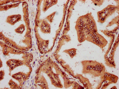 IHC image of CSB-PA15557A0Rb diluted at 1:600 and staining in paraffin-embedded human prostate tissue performed on a Leica BondTM system. After dewaxing and hydration, antigen retrieval was mediated by high pressure in a citrate buffer (pH 6.0). Section was blocked with 10% normal goat serum 30min at RT. Then primary antibody (1% BSA) was incubated at 4°C overnight. The primary is detected by a biotinylated secondary antibody and visualized using an HRP conjugated SP system.