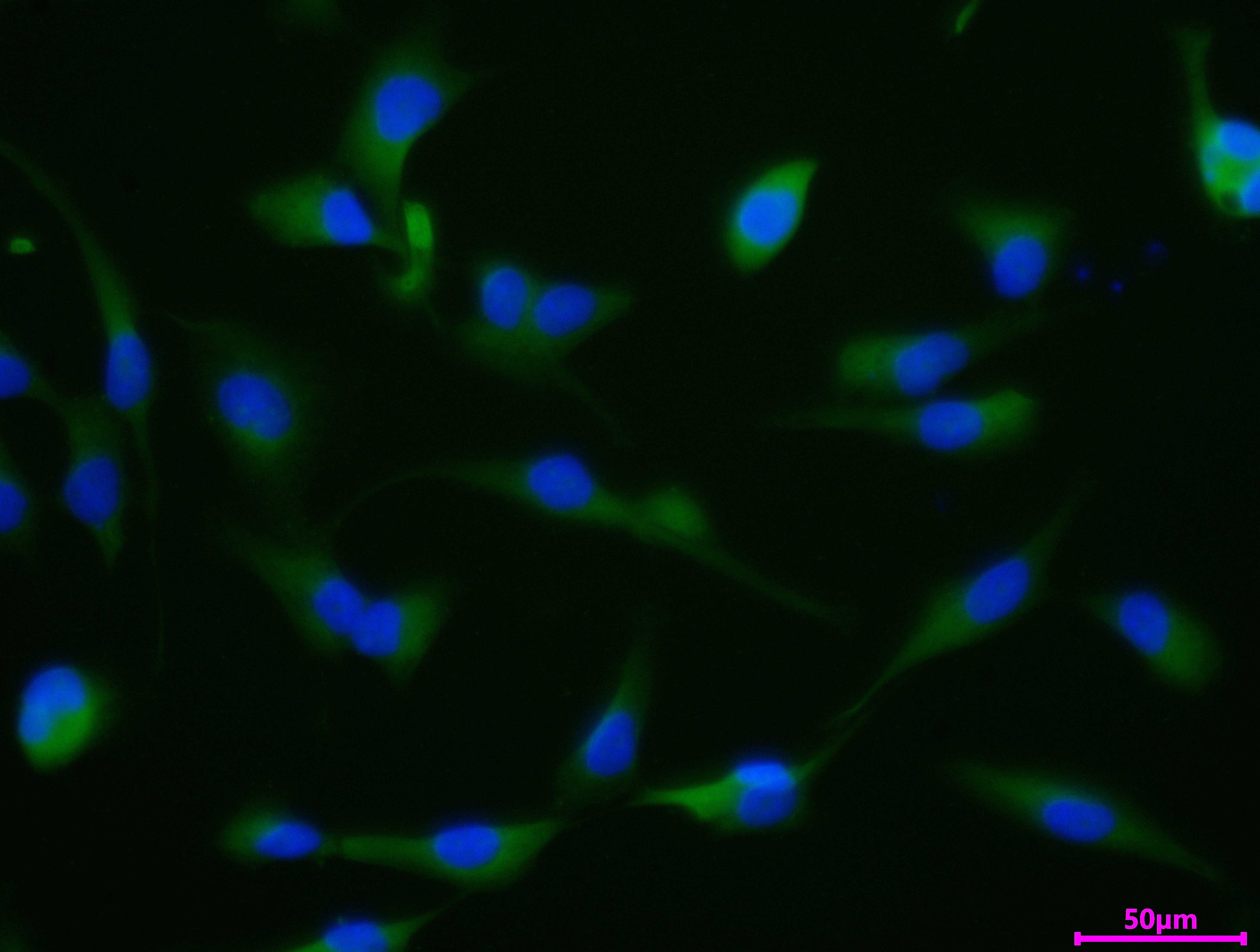 Immunofluorescence staining of U251 cell with 5% goat serum, counter-stained with DAPI. The cells were fixed in 4% formaldehyde and blocked in 10% normal Goat Serum. The cells were then incubated with the antibody overnight at 4C. The secondary antibody was Alexa Fluor 488-congugated AffiniPure Goat Anti-Rabbit IgG(H+L).
