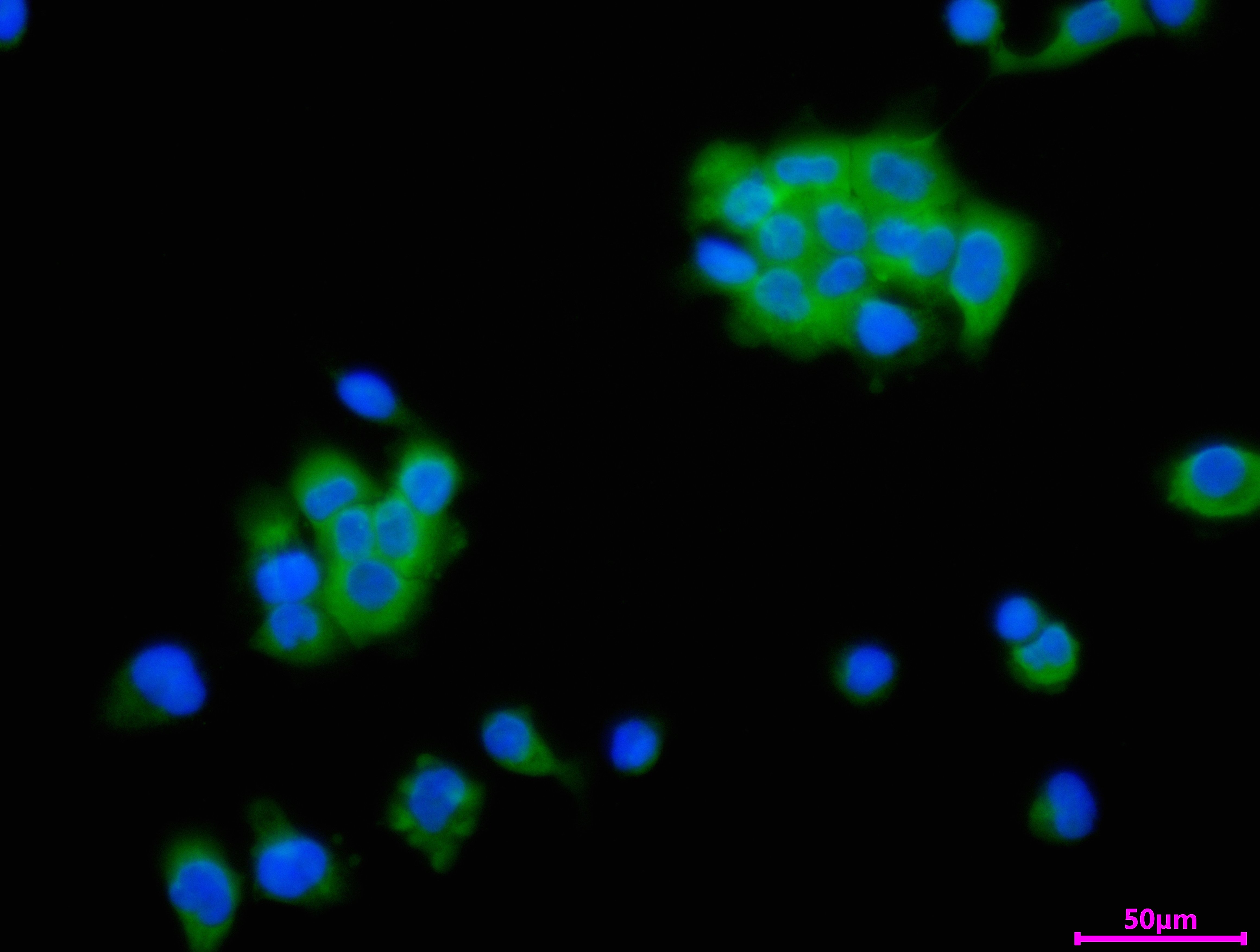 Immunofluorescence staining of A431 cell with CSB-PA619768LA01HU at 1:25, counter-stained with DAPI. The cells were fixed in 4% formaldehyde and and permeated by 0.2% TritonX-100 for 15 min. Then 10% normal goat serum to block non-specific protein-protein interactions . The cells were then incubated with the antibody overnight at 4℃. The secondary antibody was Alexa Fluor 488-congugated AffiniPure Goat Anti-Rabbit IgG(H+L).