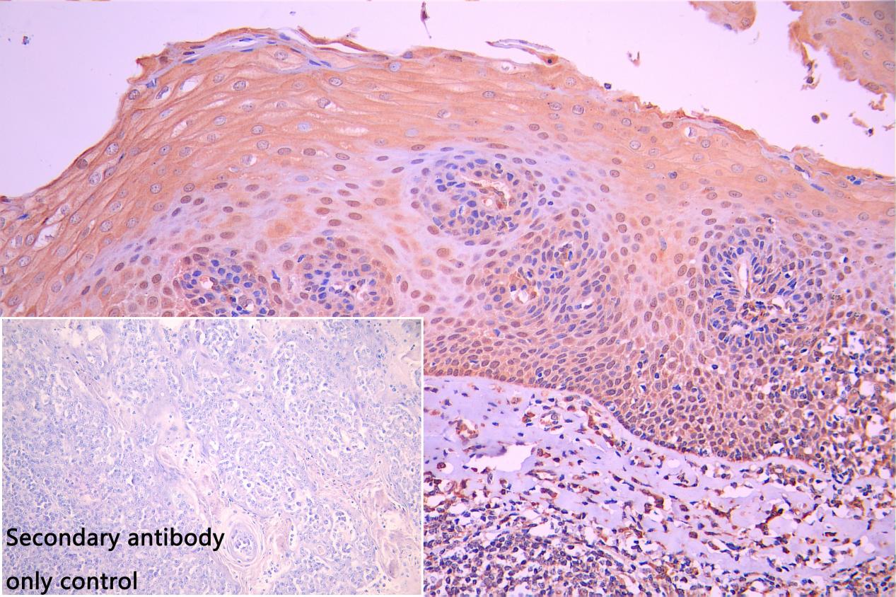 IHC image of CSB-PA619768LA01HU diluted at 1:100 and staining in paraffin-embedded human tonsil tissue performed on a Leica BondTM system. After dewaxing and hydration, antigen retrieval was mediated by high pressure in a citrate buffer (pH 6.0). Section was blocked with 10% normal goat serum 30min at RT. Then primary antibody (1% BSA) was incubated at 4°C overnight. The primary is detected by a Goat anti-rabbit polymer IgG labeled by HRP and visualized using 0.05% DAB. Secondary antibody only control: uses 1% BSA instead of primary antibody